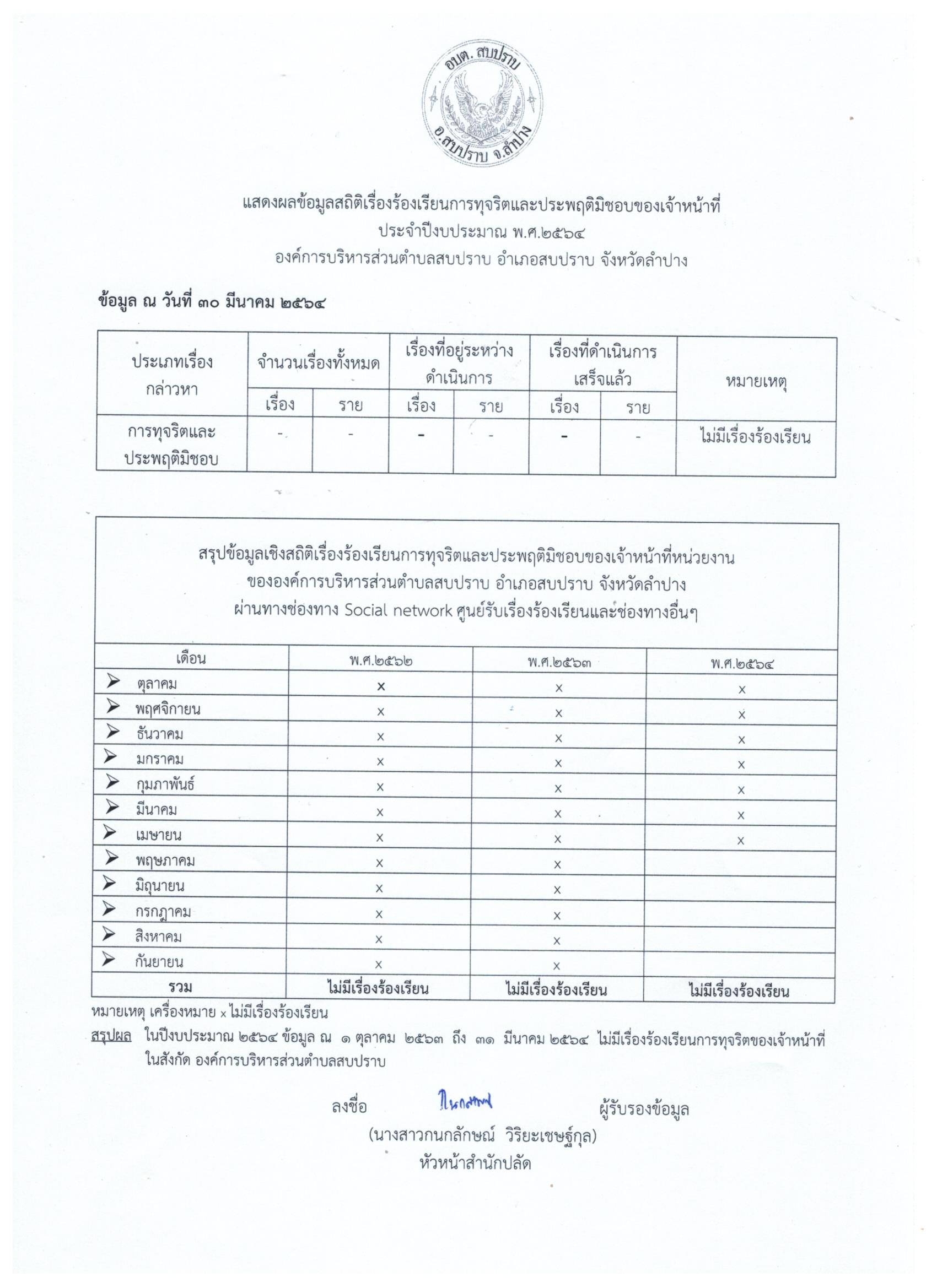 ข้อมูลสถิติเรื่องร้องเรียนการทุจริตและประพฤติมิชอบของเจ้าหน้าที่