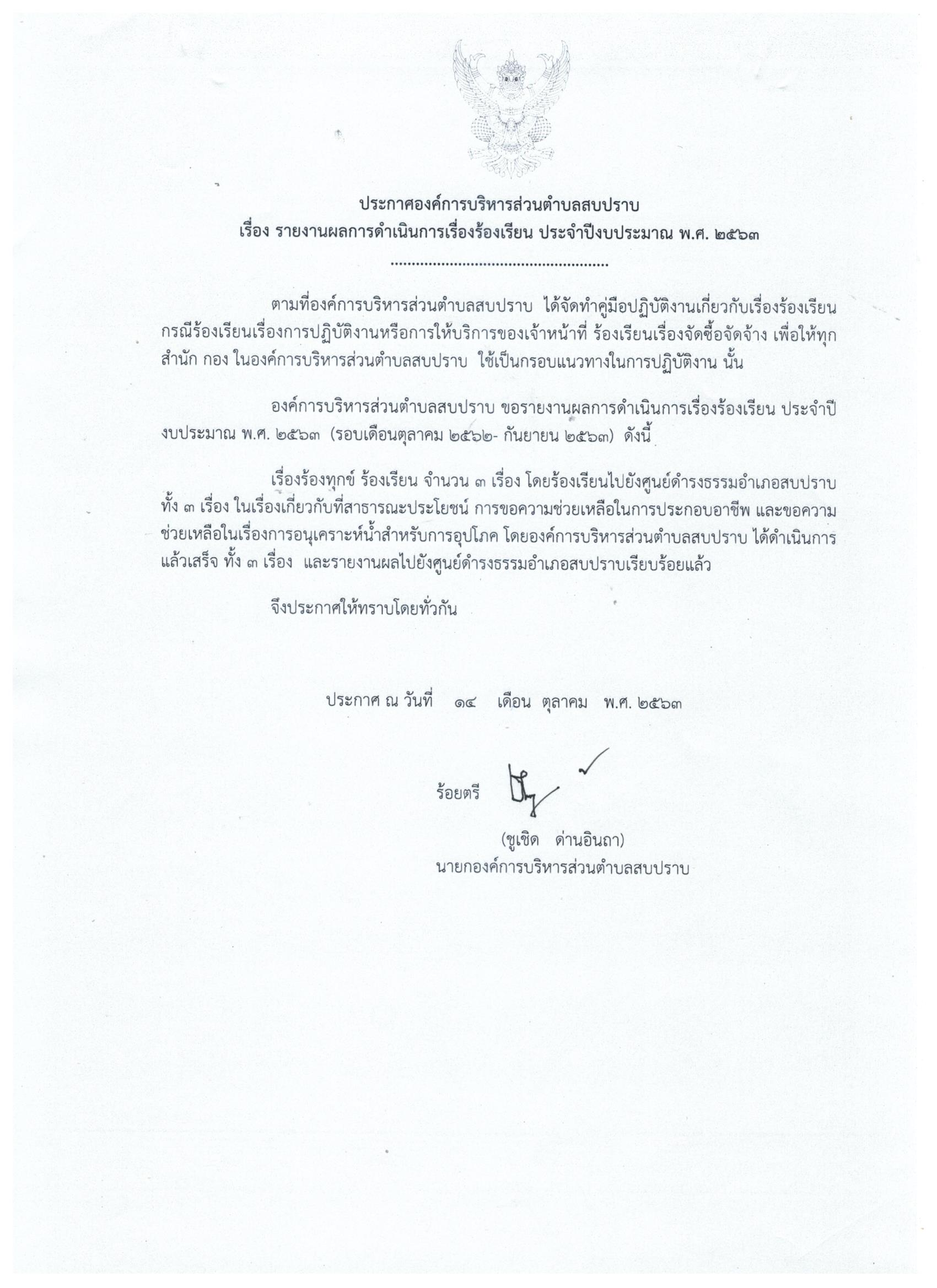 รายงานผลการดำเนินงานข้อเรียน ประจำปีงบประมาณ 2563