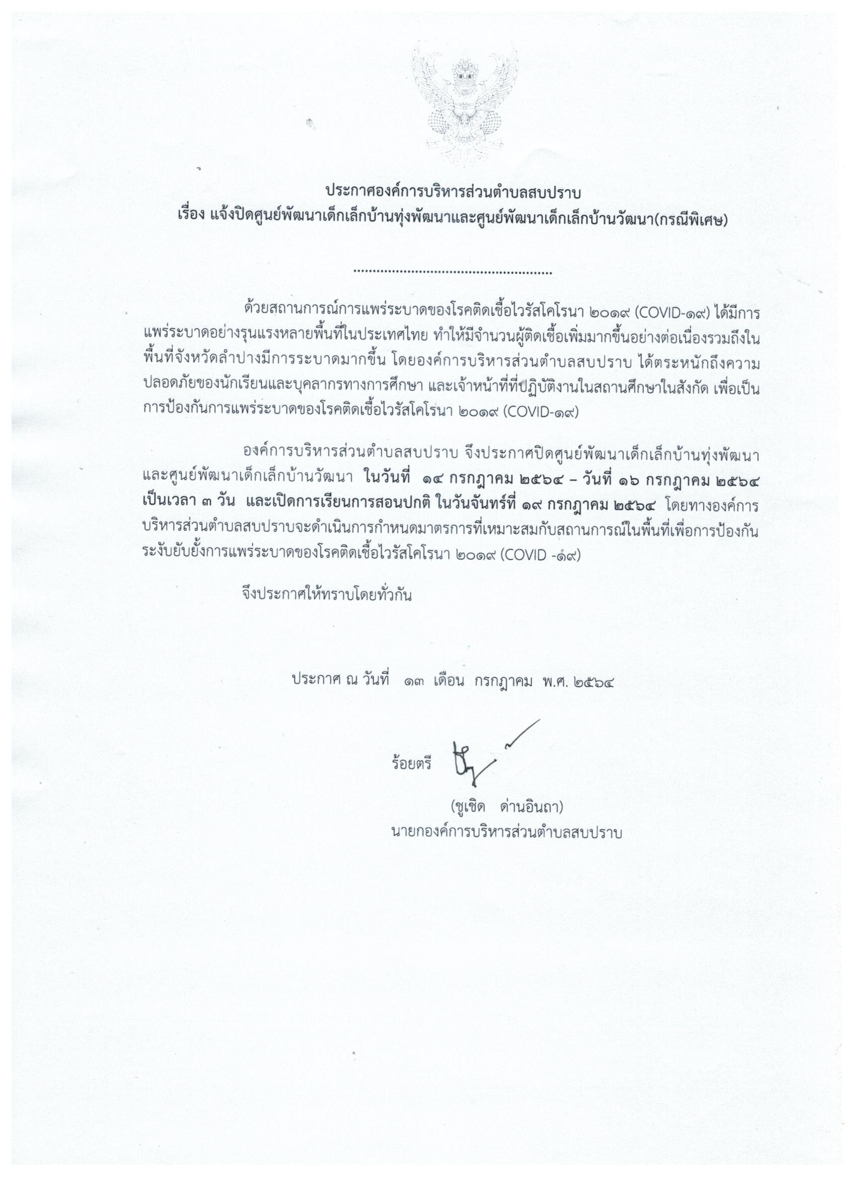 ประกาศ อบต.สบปราบ เรื่องแจ้งปิดศูนย์พัฒนาเด็กเล็กบ้านทุ่งพัฒนาและศูนย์พัฒนาเด็กเล็กบ้านวัฒนา(กรณีพิเศษ)