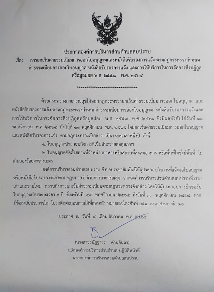 ประกาศองค์การบริหารส่วนตำบลสบปราบ เรื่อง การยกเว้นค่าธรรมเนียมการออกใบอนุญาตและหนังสือรับรองการแจ้ง ตามกฎกระทรวงกำหนดค่าธรรมเนียมการออกใบอนุญาต หนังสือรับรองการแจ้ง และการให้บริการในการจัดการสิ่งปฏิกูลหรือมูลฝอย พ.ศ. 2559 พ.ศ.2564