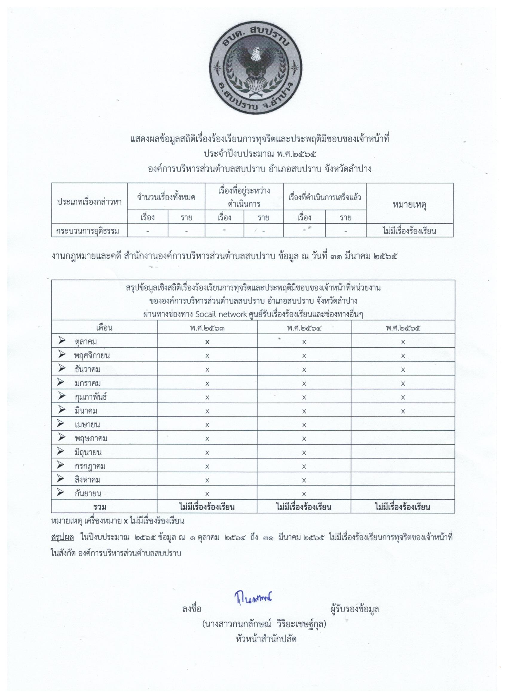 สถิติเรื่องร้องเรียนการทุจริตและประพฤติมิชอบของเจ้าหน้าที่ ประจำปี 2565