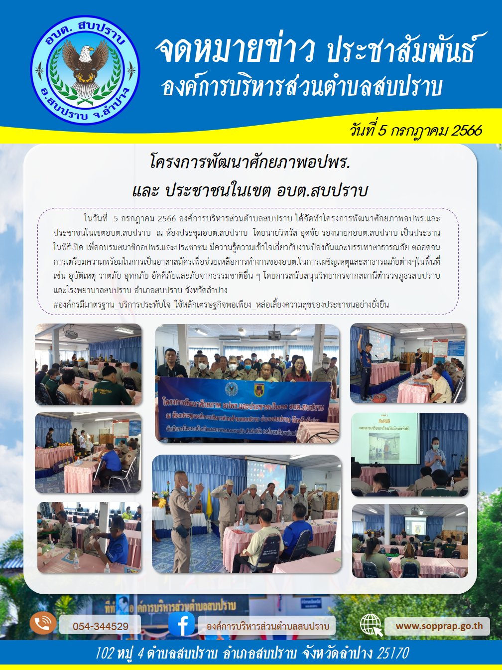 ในวันที่ 5 กรกฎาคม 2566 องค์การบริหารส่วนตำบลสบปราบ ได้จัดทำโครงการพัฒนาศักยภาพอปพร.และประชาชนในเขตอบต.สบปราบ ณ ห้องประชุมอบต.สบปราบ โดยนายวิทวัส อุดชัย รองนายกอบต.สบปราบ เป็นประธาน ในพิธีเปิด เพื่ออบรมสมาชิกอปพร.และประชาชน มีความรู้ความเข้าใจเกี่ยวกับงานป้องกันและบรรเทาสาธารณภัย ตลอดจนการเตรียมความพร้อมในการเป็นอาสาสมัครเพื่อช่วยเหลือการทำงานของอบต.ในการเผชิญเหตุและสาธารณภัยต่างๆในพื้นที่ เช่น อุบัติเหตุ วาตภัย อุทกภัย อัคคีภัยและภัยจากธรรมชาติอื่น ๆ โดยการสนับสนุนวิทยากรจากสถานีตำรวจภูธรสบปราบและโรงพยาบาลสบปราบ อำเภอสบปราบ จังหวัดลำปาง