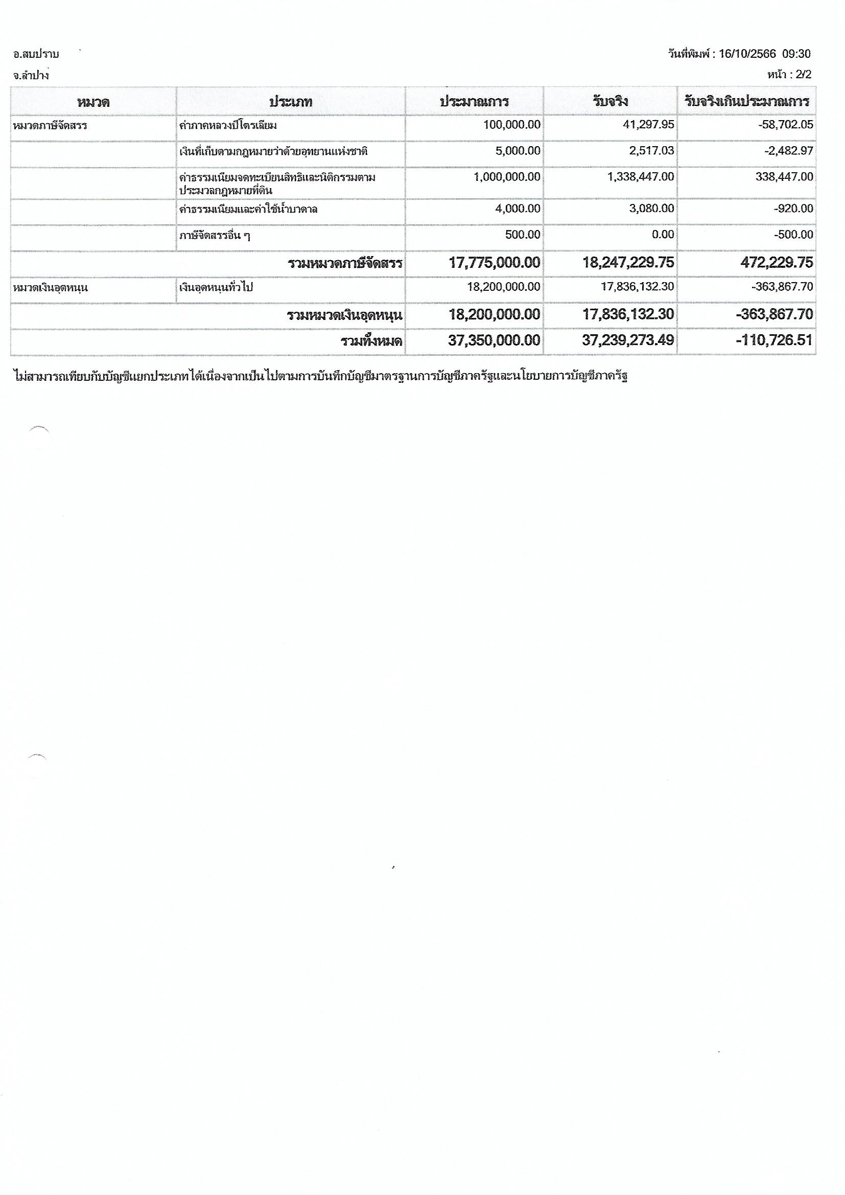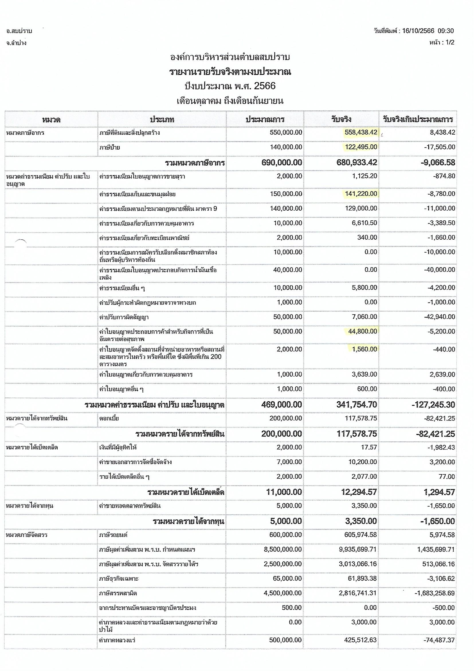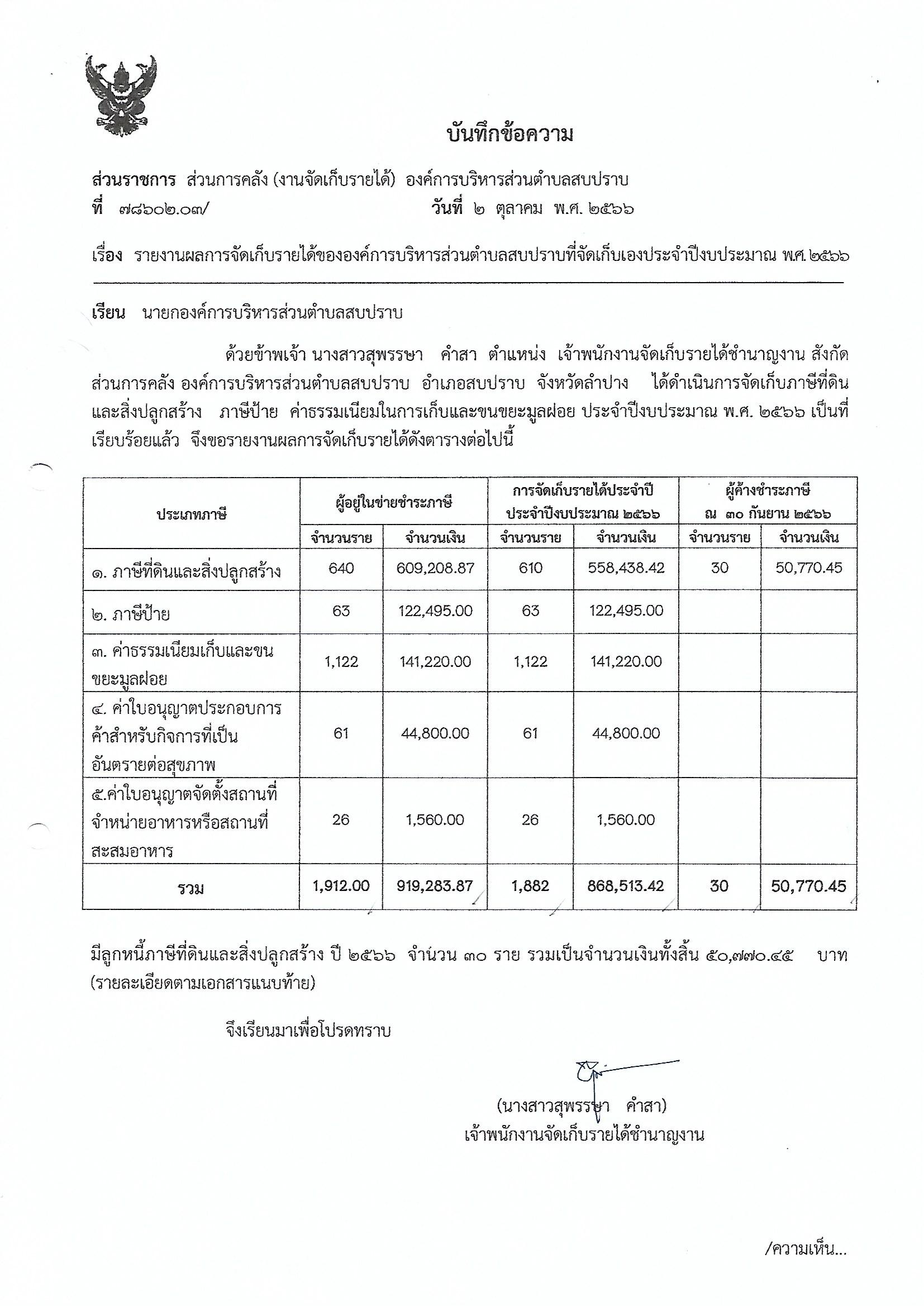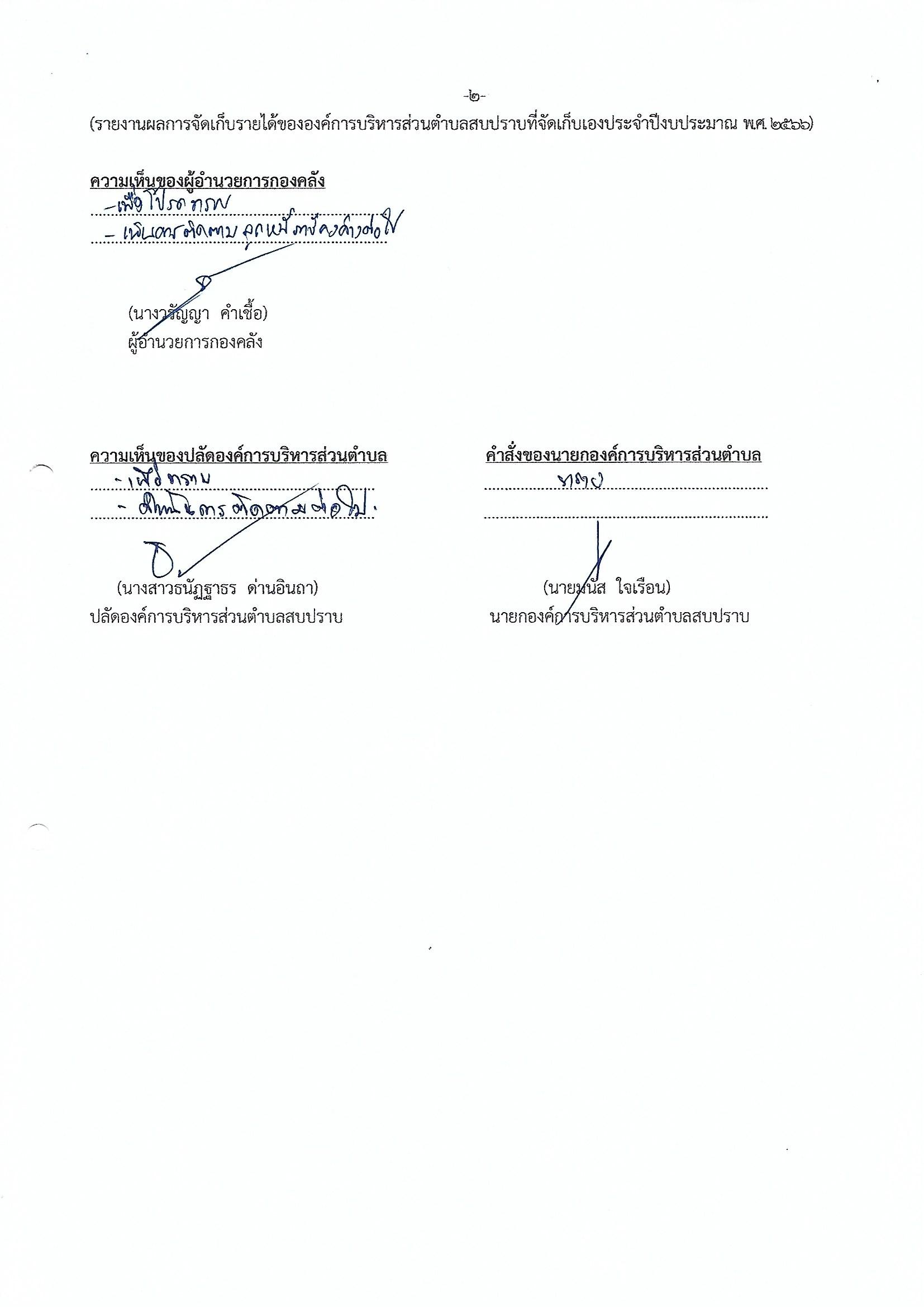 รายงานผลการจัดเก็บรายได้ขององค์การบริหารส่วนตำบลสบปราบที่จัดเก็บเอง ประจำปีงบประมาณ พ.ศ.2566