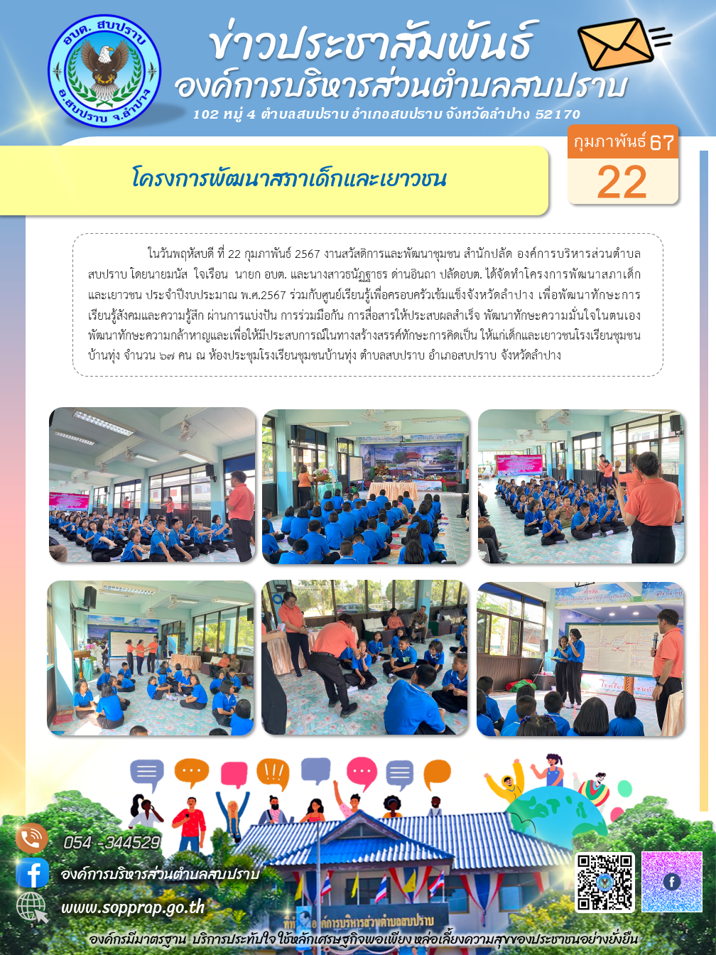 ประชาสัมพันธ์ โครงการพัฒนาสภาเด็กและเยาวชน ประจำปีงบประมาณ พ.ศ.2567 ร่วมกับศูนย์เรียนรู้เพื่อครอบครัวเข้มแข็งจังหวัดลำปาง