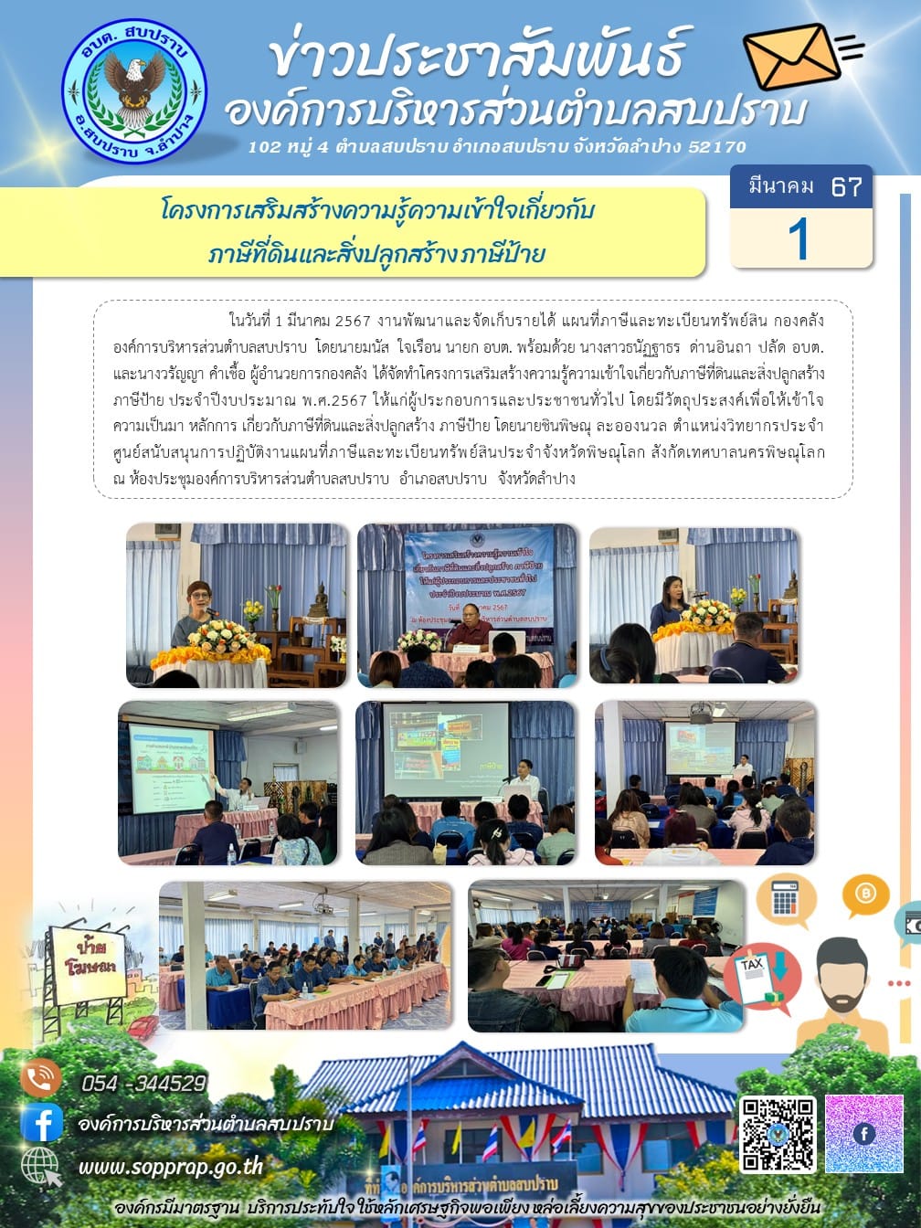 ประชาสัมพันธ์โครงการเสริมสร้างความรู้ความเข้าใจเกี่ยวกับภาษีที่ดินและสิ่งปลูกสร้าง ภาษีป้าย ประจำปีงบประมาณ พ.ศ.2567