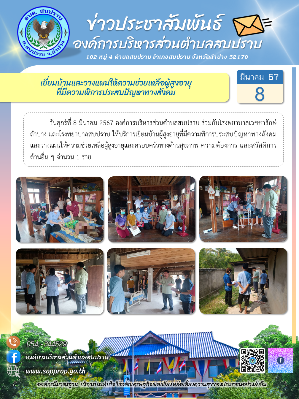 ประชาสัมพันธ์ ให้บริการเยี่ยมบ้านผู้สูงอายุที่มีความพิการประสบปัญหาทางสังคม และวางแผนให้ความช่วยเหลือผู้สูงอายุและครอบครัวทางด้านสุขภาพ ความต้องการ และสวัสดิการด้านอื่น ๆ