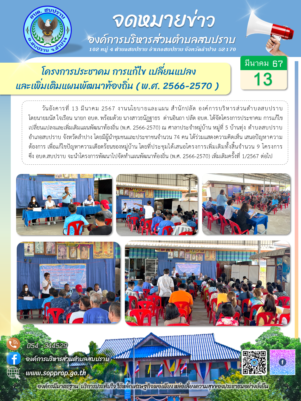 จดหมายข่าว โครงการประชาคม การแก้ไข เปลี่ยนแปลงและเพิ่มเติมแผนพัฒนาท้องถิ่น (พ.ศ. 2566-2570) ณ ศาลาประจำหมู่บ้าน หมู่ที่ 5 บ้านทุ่ง ตำบลสบปราบ อำเภอสบปราบ จังหวัดลำปาง