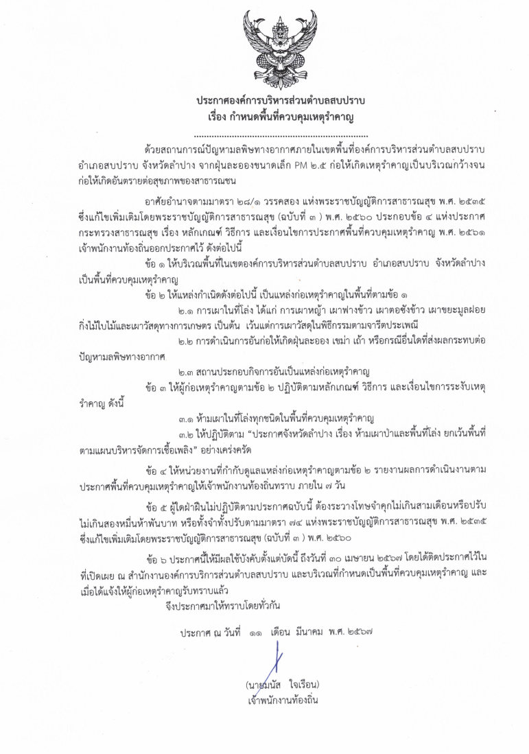 ประกาศอบต.สบปราบ เรื่่อง กำหนดพื้นที่ควบคุมเหตุรำคาญ