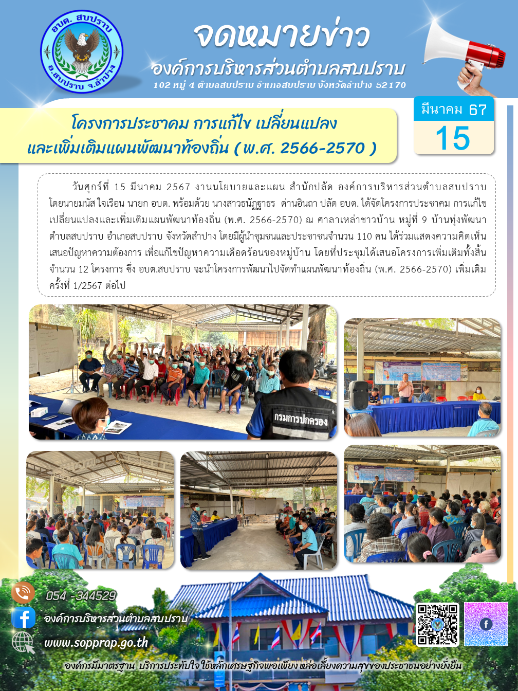 จดหมายข่าว โครงการประชาคม การแก้ไข เปลี่ยนแปลงและเพิ่มเติมแผนพัฒนาท้องถิ่น (พ.ศ. 2566-2570) ณ ศาลาเหล่าชาวบ้าน หมู่ที่ 9 บ้านทุ่งพัฒนา ตำบลสบปราบ อำเภอสบปราบ จังหวัดลำปาง
