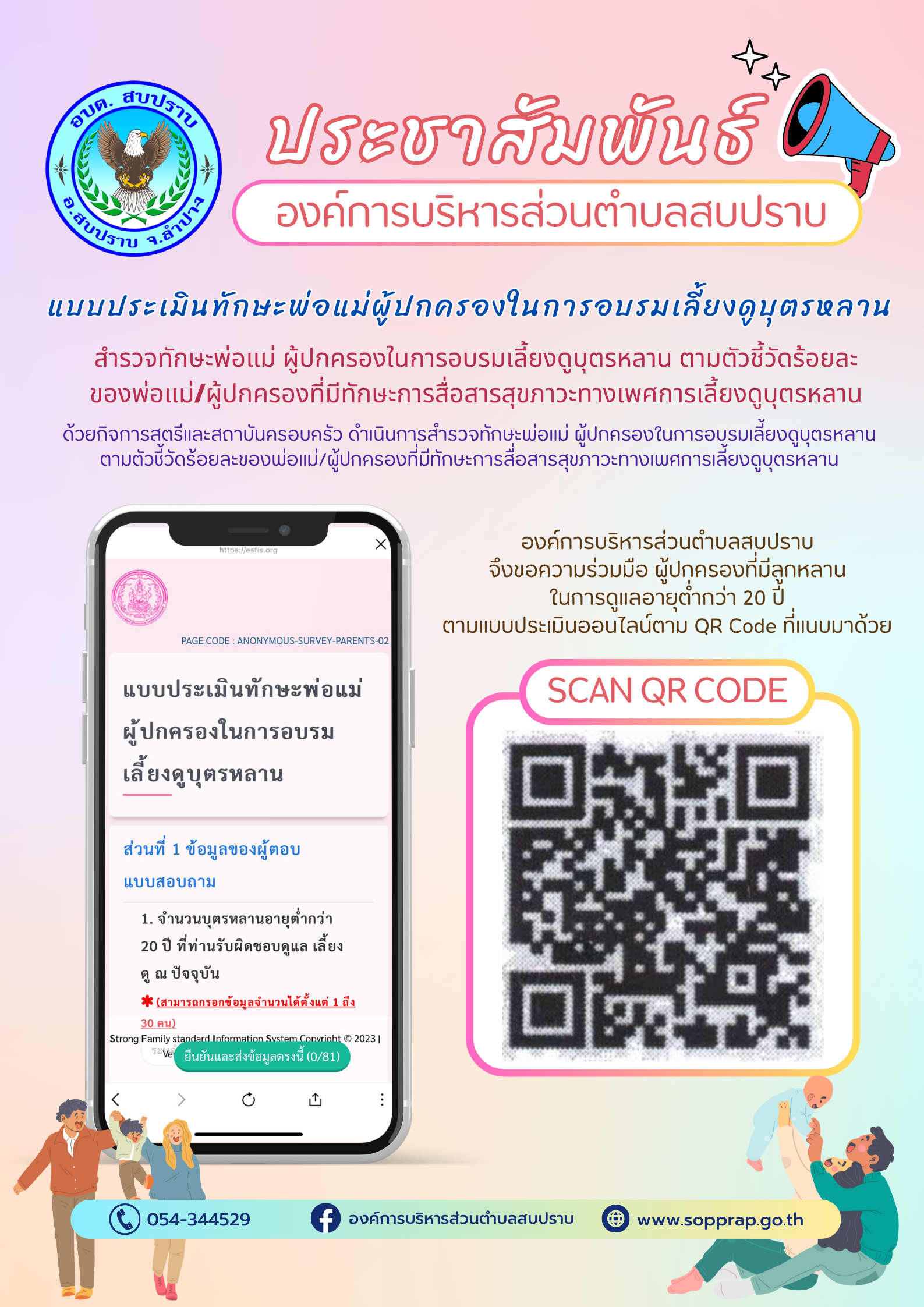 อบต.สบปราบ ขอความร่วมมือ ผู้ปกครองที่มีลูกหลาน ในการดูแลอายุต่ำกว่า 20 ปี ทำแบบประเมินออนไลน์ทักษะพ่อแม่ผู้ปกครองในการอบรมเลี้ยงดูบุตรหลาน ตาม QR Code ที่แนบมาด้วย