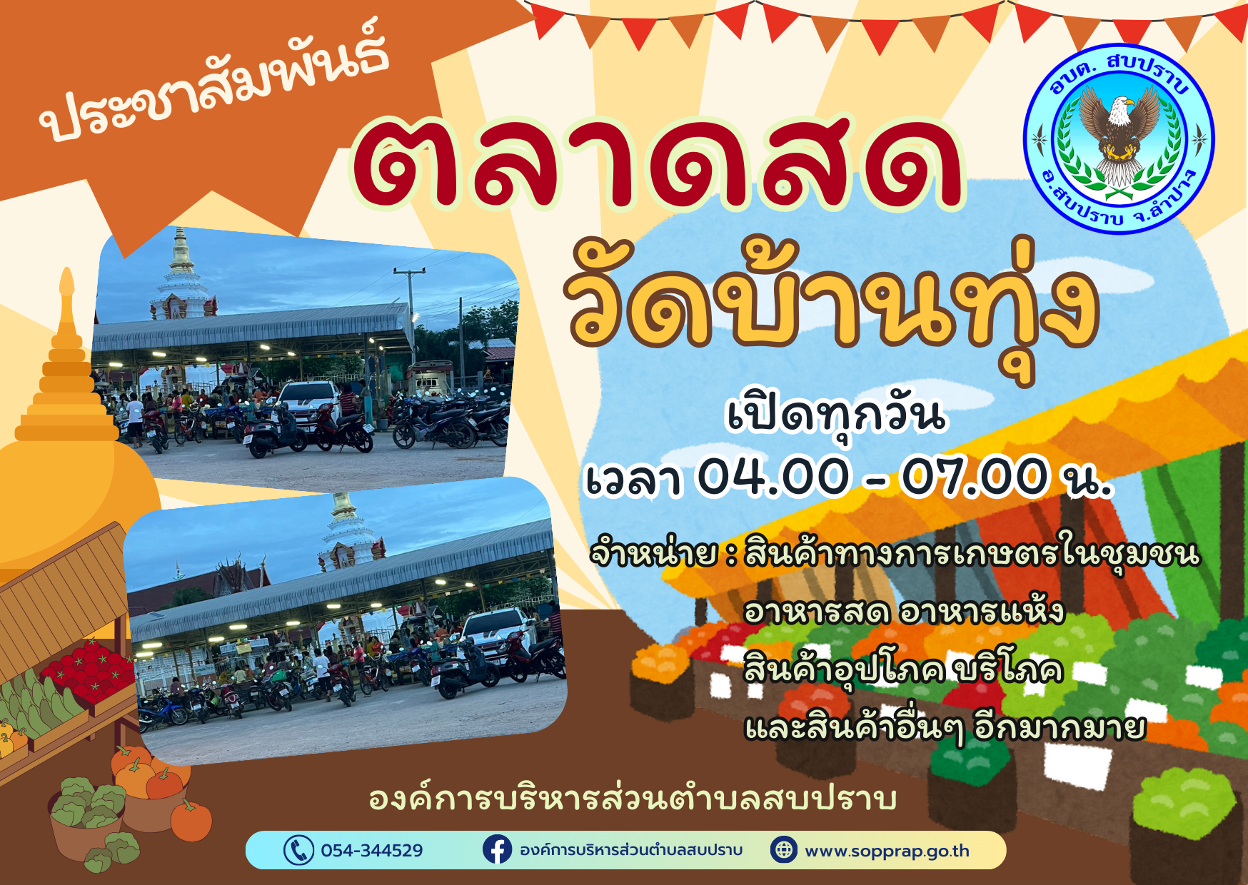 ประชาสัมพันธ์ ตลาดสดวัดบ้านทุ่ง เปิดบริการทุกวัน ตั้งแต่เวลา 04.00 - 07.00 น มีสินค้าทางการเกษตร และสินค้าอื่นๆจำหน่ายอีกมากมาย