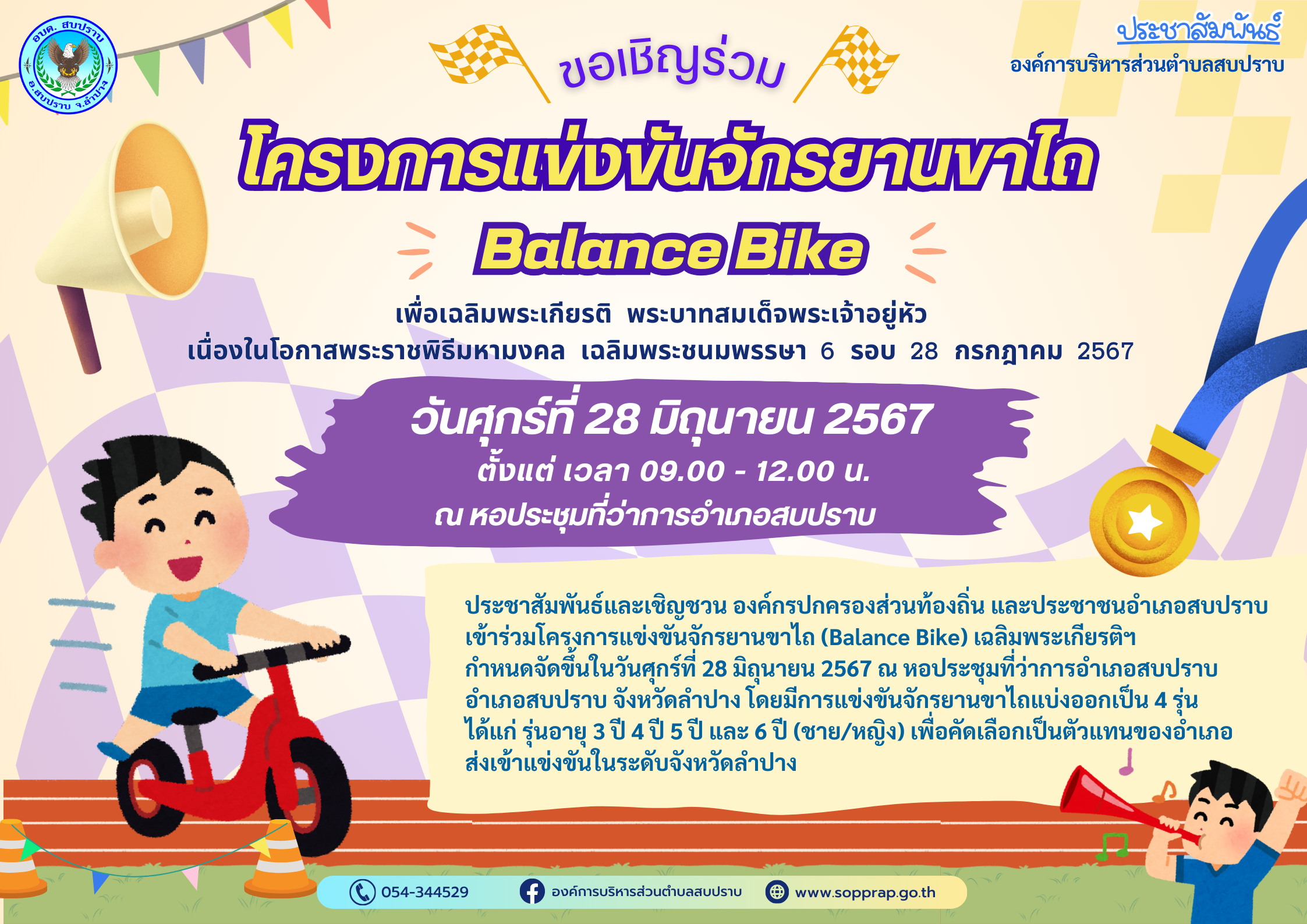 ประชาสัมพันธ์และเชิญชวนร่วม โครงการแข่งขันจักรยานขาไถ (Balance Bike) เฉลิมพระเกียรติ พระบาทสมเด็จพระเจ้าอยู่หัว เนื่องในโอกาสพระราชพิธีมหามงคล เฉลิมพระชนมพรรษา 6 รอบ 28 กรกฎาคม 2567