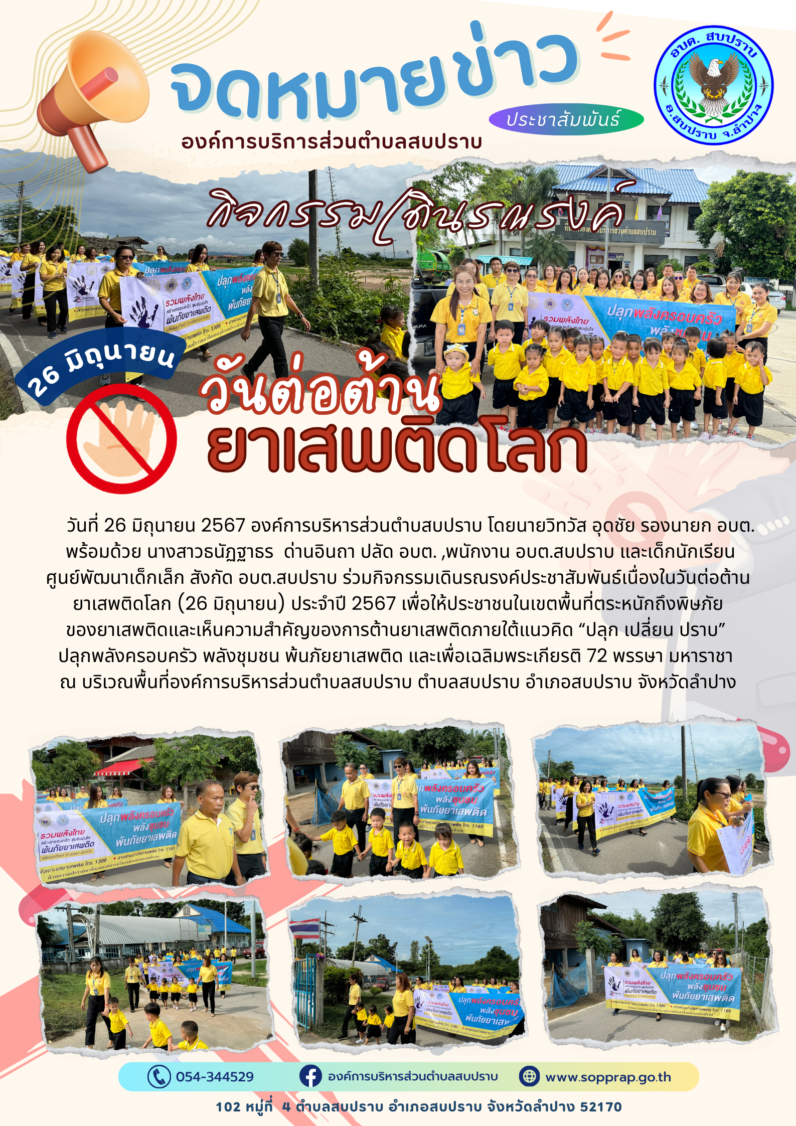 วันที่ 26 มิถุนายน 2567 องค์การบริหารส่วนตำบสบปราบ โดยนายวิทวัส อุดชัย รองนายก อบต. พร้อมด้วย นางสาวธนัฏฐาธร ด่านอินถา ปลัด อบต. ,พนักงาน อบต.สบปราบ และเด็กนักเรียนศูนย์พัฒนาเด็กเล็ก สังกัด อบต.สบปราบ ร่วมกิจกรรมเดินรณรงค์ประชาสัมพันธ์เนื่องในวันต่อต้านยาเสพติดโลก (26 มิถุนายน) ประจำปี 2567 เพื่อให้ประชาชนในเขตพื้นที่ตระหนักถึงพิษภัยของยาเสพติดและเห็นความสำคัญของการต้านยาเสพติดภายใต้แนวคิด “ปลุก เปลี่ยน ปราบ” ปลุกพลังครอบครัว พลังชุมชน พ้นภัยยาเสพติด และเพื่อเฉลิมพระเกียรติ 72 พรรษา มหาราชา