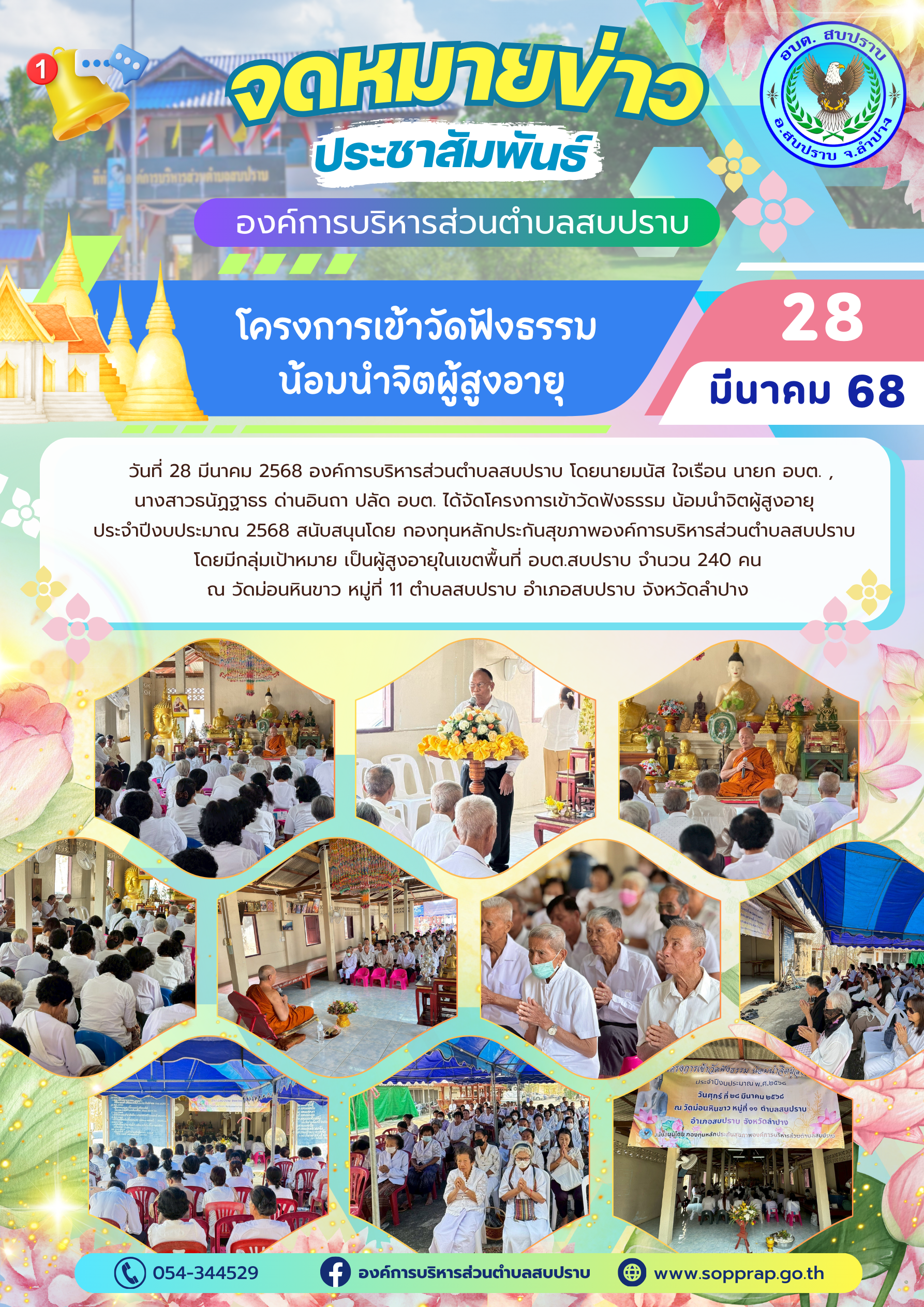 จดหมายข่าว ประชาสัมพันธ์ โครงการเข้าวัดฟังธรรม น้อมนำจิตผู้สูงอายุ ประจำปีงบประมาณ 2568 สนับสนุนโดย กองทุนหลักประกันสุขภาพองค์การบริหารส่วนตำบลสบปราบ