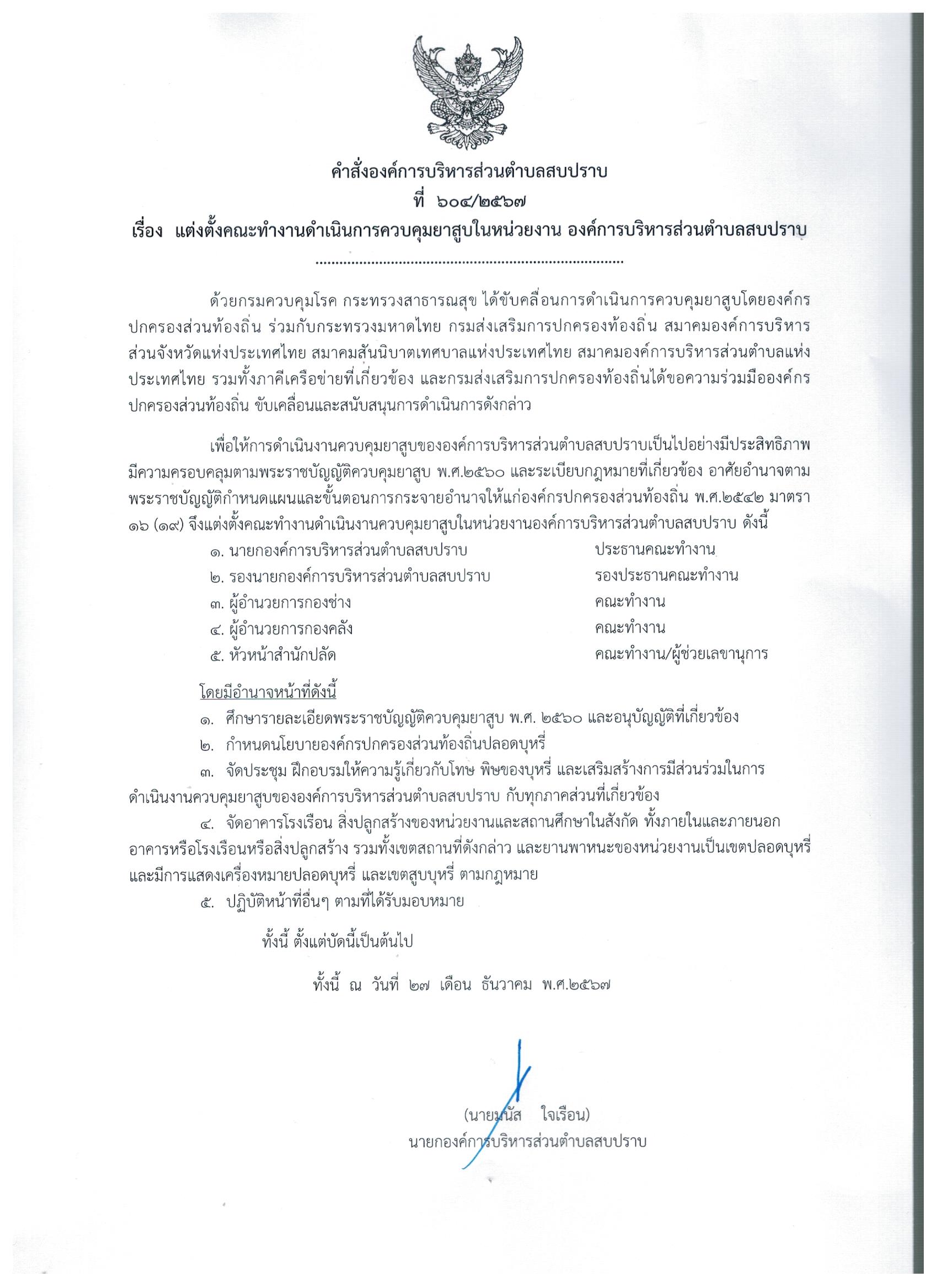 คำสั่ง อบต.สบปราบ เรื่อง แต่งตั้งคณะทำงานดำเนินการควบคุมยาสูบในหน่วยงาน อบต.สบปราบ
