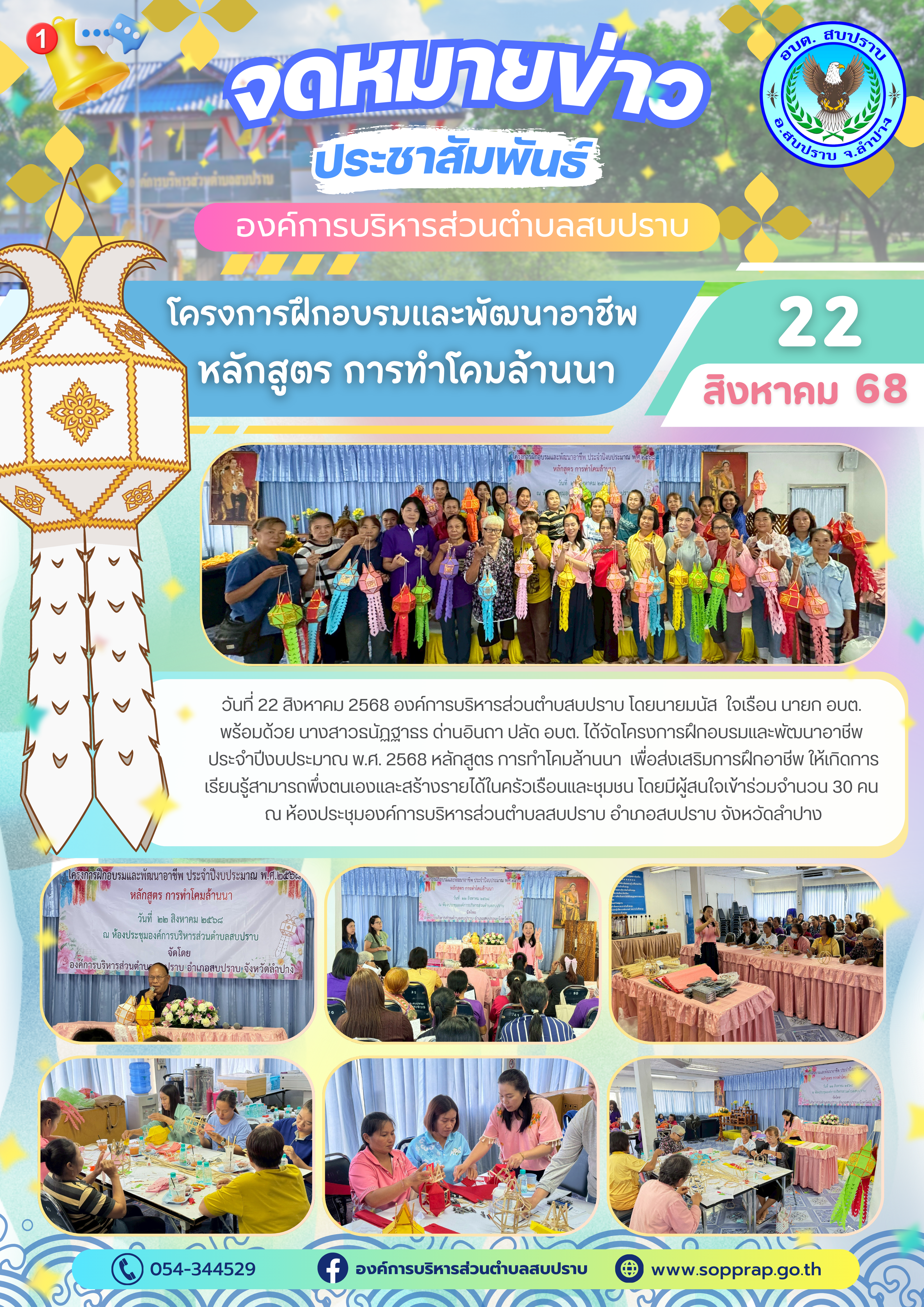 วันที่ 22 สิงหาคม 2568 องค์การบริหารส่วนตำบสบปราบ โดยนายมนัส ใจเรือน นายก อบต. พร้อมด้วย นางสาวธนัฏฐาธร ด่านอินถา ปลัด อบต. ได้จัดโครงการฝึกอบรมและพัฒนาอาชีพ ประจำปีงบประมาณ พ.ศ. 2568 หลักสูตร การทำโคมล้านนา เพื่อส่งเสริมการฝึกอาชีพ ให้เกิดการเรียนรู้สามารถพึ่งตนเองและสร้างรายได้ในครัวเรือนและชุมชน โดยมีผู้สนใจเข้าร่วมจำนวน 30 คน ณ ห้องประชุมองค์การบริหารส่วนตำบลสบปราบ อำเภอสบปราบ จังหวัดลำปาง
