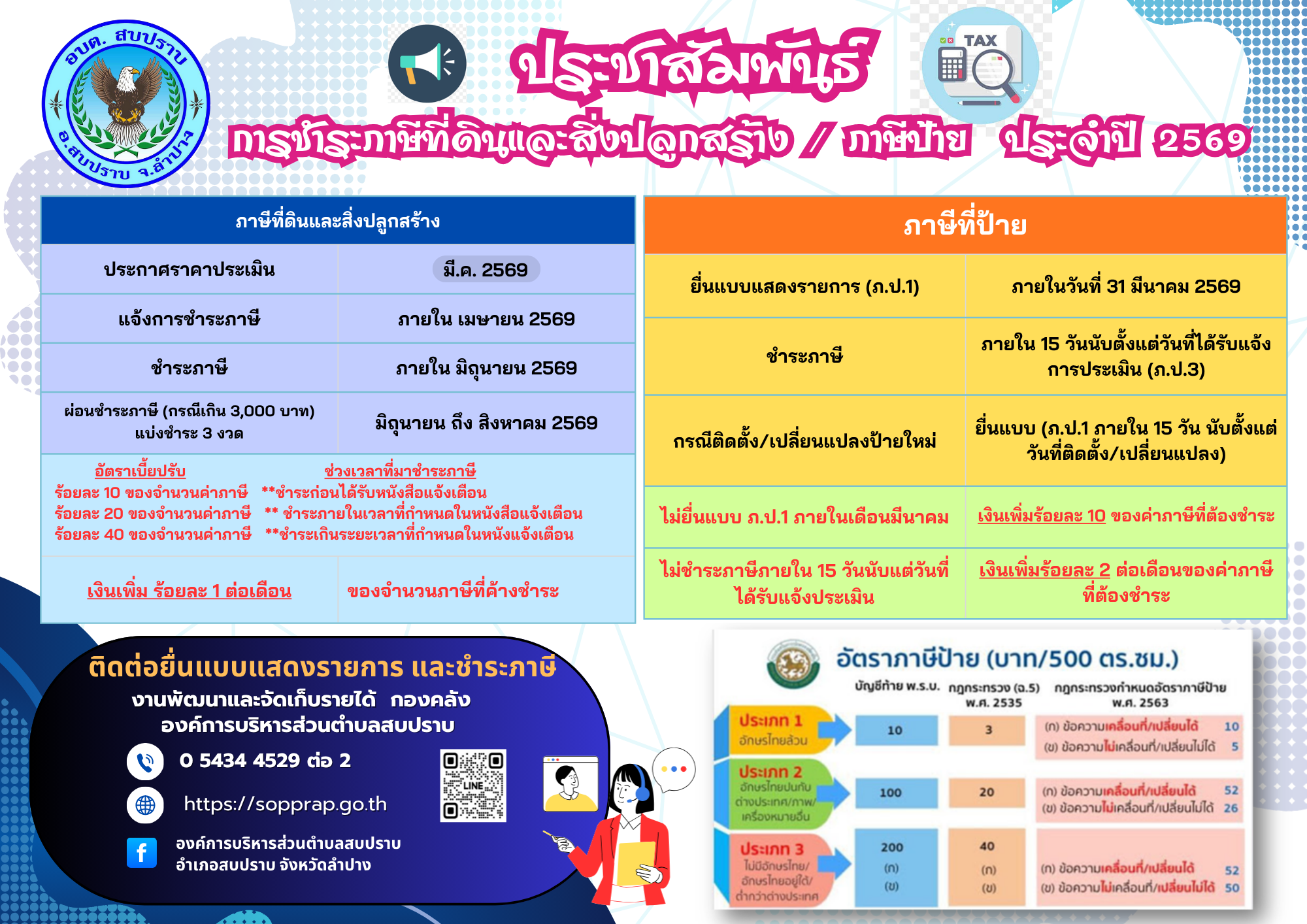 ประชาสัมพันธ์การชำระภาษีที่ดินและสิ่งปลูกสร้าง / ภาษีป้าย ประจำปี พ.ศ. 2569