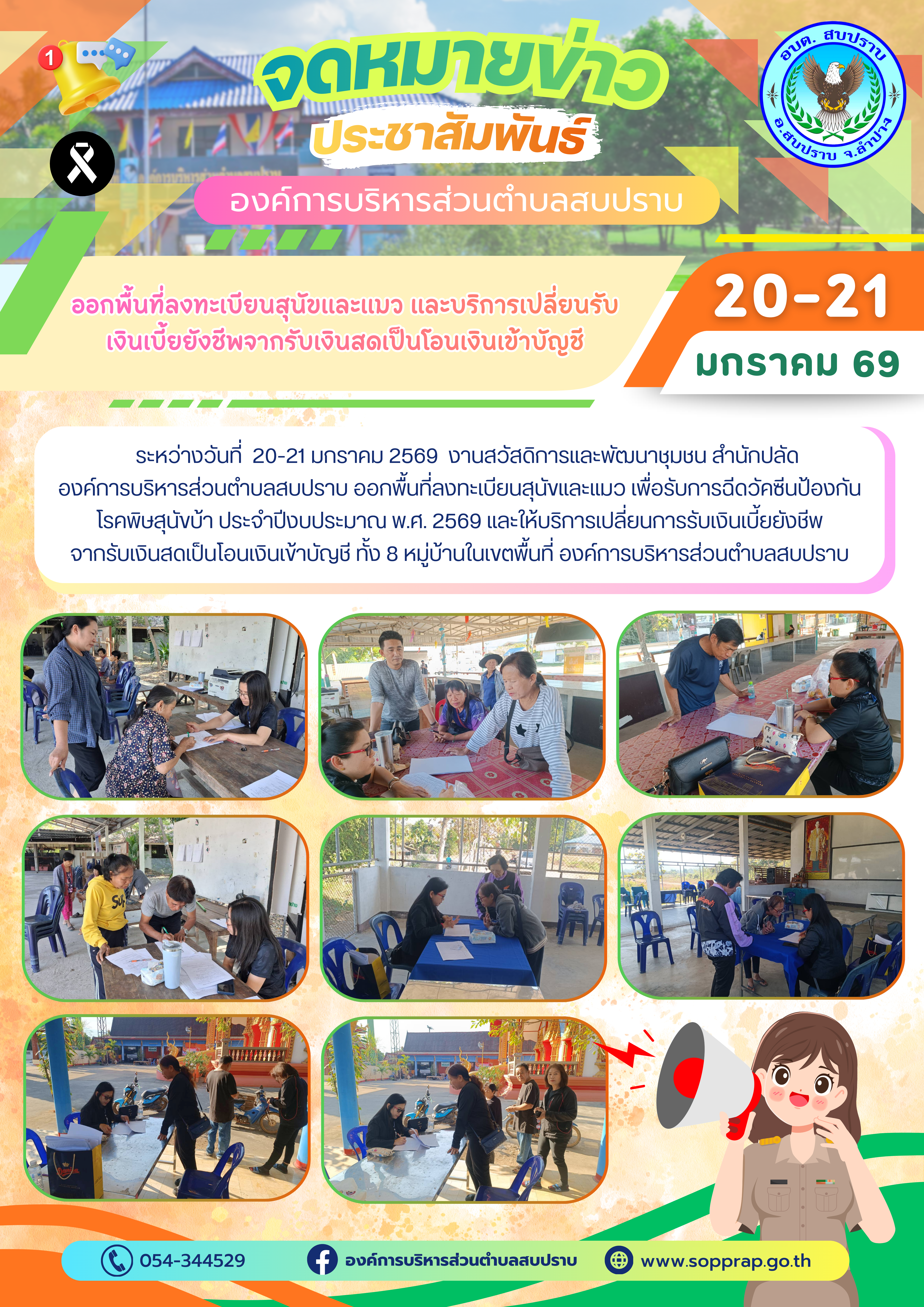องค์การบริหารส่วนตำบลสบปราบ ออกพื้นที่ลงทะเบียนสุนัขและแมว เพื่อรับการฉีดวัคซีนป้องกันโรคพิษสุนัขบ้า ประจำปีงบประมาณ พ.ศ. 2569 และให้บริการเปลี่ยนการรับเงินเบี้ยยังชีพ